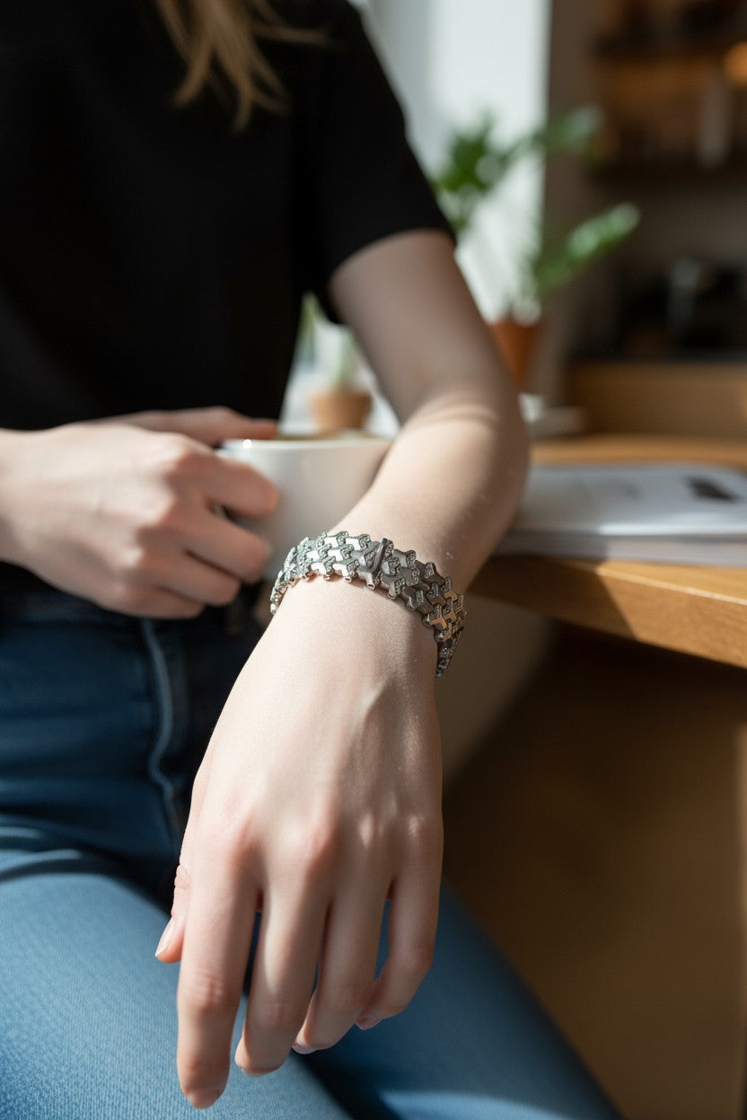 Pelleni Şık Bilezik, paslanmaz çelik malzemeden üretilmiştir ve uzun süre parlaklığını korur.